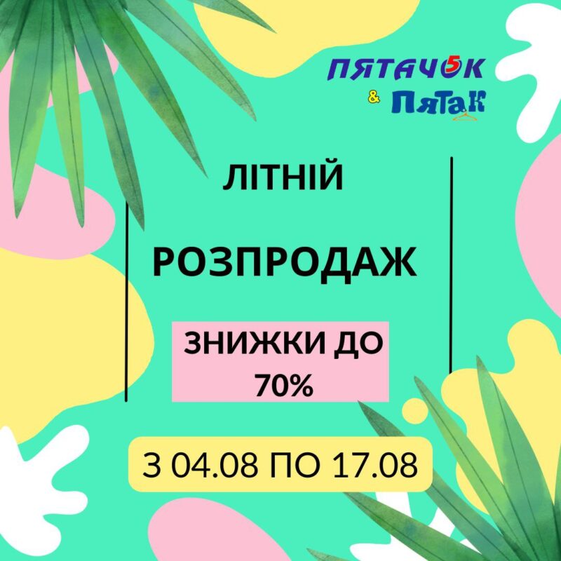 З 04.08 2023р по 17.08.2023р в мережі магазинів “ПЯТАК & ПЯТАЧОК” пройде розпродаж літньої колекції одягу, аксесуарів та багато іншого. Знижки від 20% до 70%! Приходьте, ми очікуємо Вас.