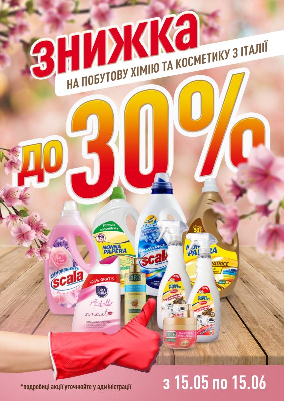 З 15.05.2021р до 15.06.2021р в мережі магазинів Пятак&Пятачок діють знижки до 30% на побутову хімію та косметику з Італії!!! Завітайте до нас у магазини Підписуйтесь на нашу сторінку в Інстаграм щоб слідкувати за новинами https://instagram.com/pyatachok_pyatak При винекненні питань, або з привіду пропозицій звертайтесь за номерами вказаними на сторінці https://piatachok.com.ua/uk/kontakti/