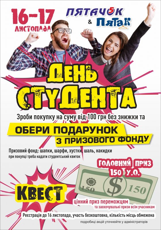 У мережі магазинів П’ятак та П’ятачок будуть проводиться дві акції до дня студента: Зробіть покупку на 100 гривень, пред’явіть студентський квиток і отримаєте шапку або шарф в подарунок. Акція діє 16-17 листопада в магазинах Миколаєва і Херсона 17 листопада наша мережа магазинів буде проводити квест з головним призів 150 доларів. Всі команди отримають призи. Беруть…