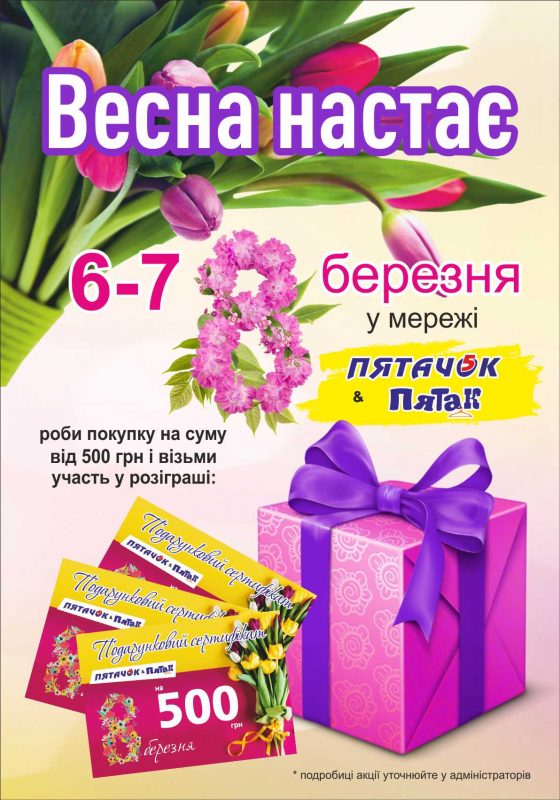 Запрошуємо всіх наших покупців взяти участь в розіграші сертифікатів на покупку в мережі магазинів “П’ятак та П’ятачок”. Робіть покупку від 500 гривень 6-8 березня і вигравайте сертифікати. У нас завжди чесні розіграші.