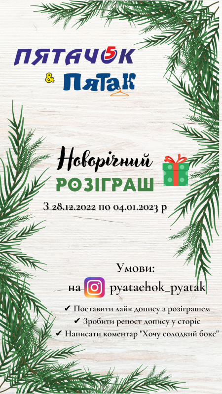 Акція до Різдвяних та Новорічних свят з 28.12.2022 р. по 04.01.2022 р. Умови для участі максимально прості: ✔️ Бути підписаним на нашу сторінку: pyatachok_pyatak ✔️ Поставити лайк допису із розіграшем ✔️ Зробити репост цього допису у сторіс ✔️ Написати коментар – “Хочу солодкий бокс”