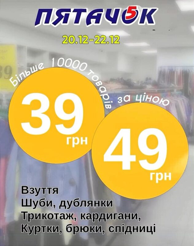 🎉🤗 Attention! On 16.02.2024, a new Pyatak store opened. 📍 Address: 68A Kosmonavtiv Street (corner of Mykolaivska Street). 🔥 The store offers more than 10,000 items and 800 pairs of shoes. ❤️ Women’s, men’s and children’s clothing, footwear, accessories, household goods. 🤝 Come, we are waiting for you!